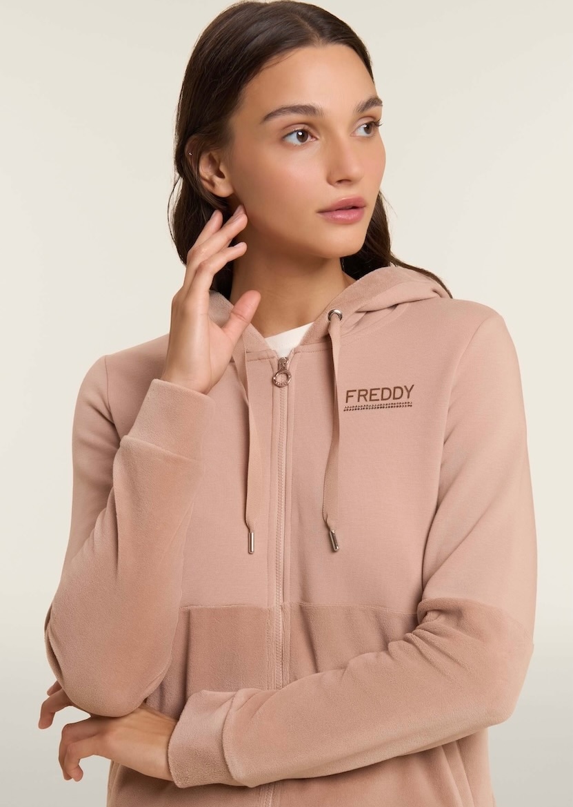 身頃と袖の下部、フードの縁にはベロア素材♡